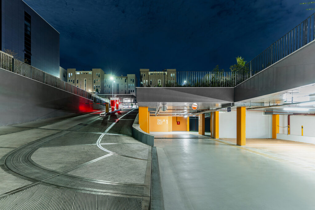 At ground level, the project integrates 2000 sqm of commercial units, alongside a public space design that enhances the pedestrian experience. The roof of the parking structure is transformed into an elevated park, offering pedestrian pathways, seating areas, and green spaces, creating a vibrant and accessible urban environment.